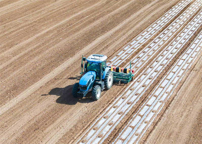 | Un tracteur autonome équipé du système de navigation par satellite Beidou sème du coton dans le comté de Hutubi, dans la région autonome ouïgoure du Xinjiang (nord-ouest de la Chine). (Photo/He Long) |