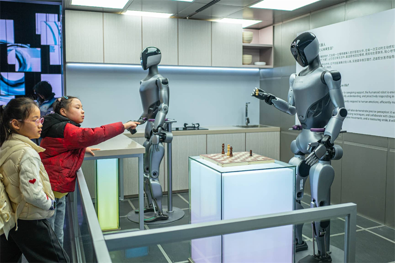| Des visiteurs découvrent les robots humanoïdes exposés au Musée des sciences et technologies de Shanghai (est de la Chine). (Photo/Wang Chu) |
