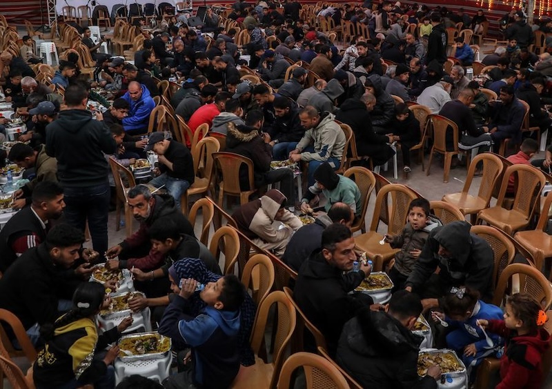 | Des Palestiniens participent à un repas collectif le premier jour du ramadan dans une école transformée en refuge à Beit Lahia, dans le nord de la bande de Gaza, le 18 février 2026. (Xinhua/Rizek Abdeljawad) |