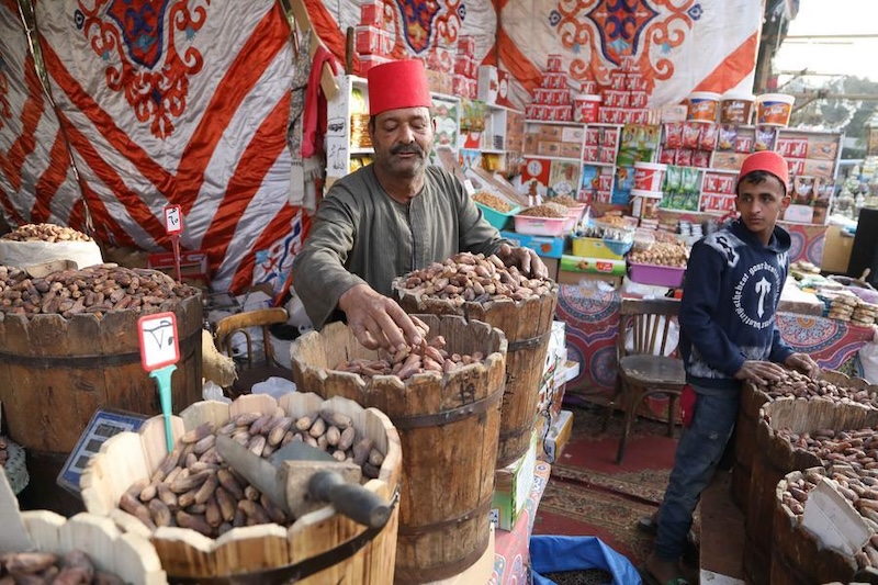 | Un vendeur dispose des dattes le premier jour du ramadan sur un marché du Caire, en Egypte, le 19 février 2026. (Xinhua/Ahmed Gomaa) |